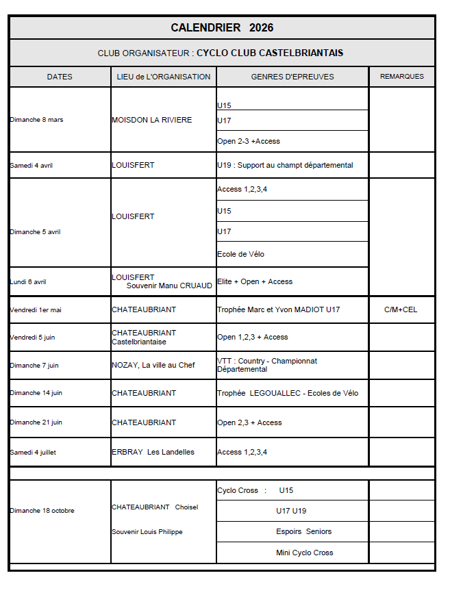 VOIR EN IMAGE LE CALENDRIER DES ORGANISATIONS 2026 DU CYCLO CLUB CASTELBRIANTAIS