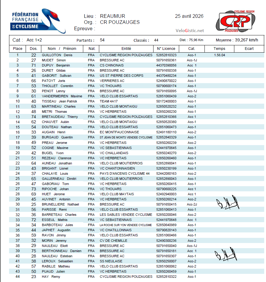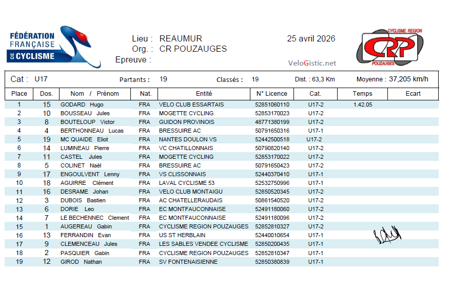 Remerciements au CR Pouzauges