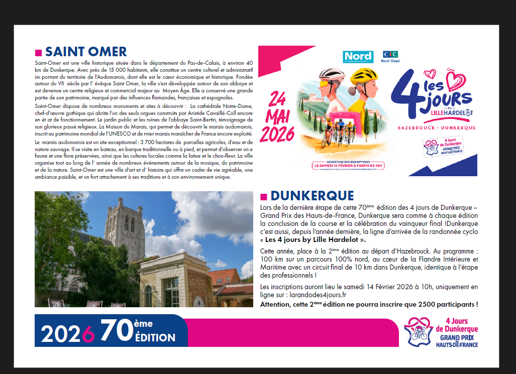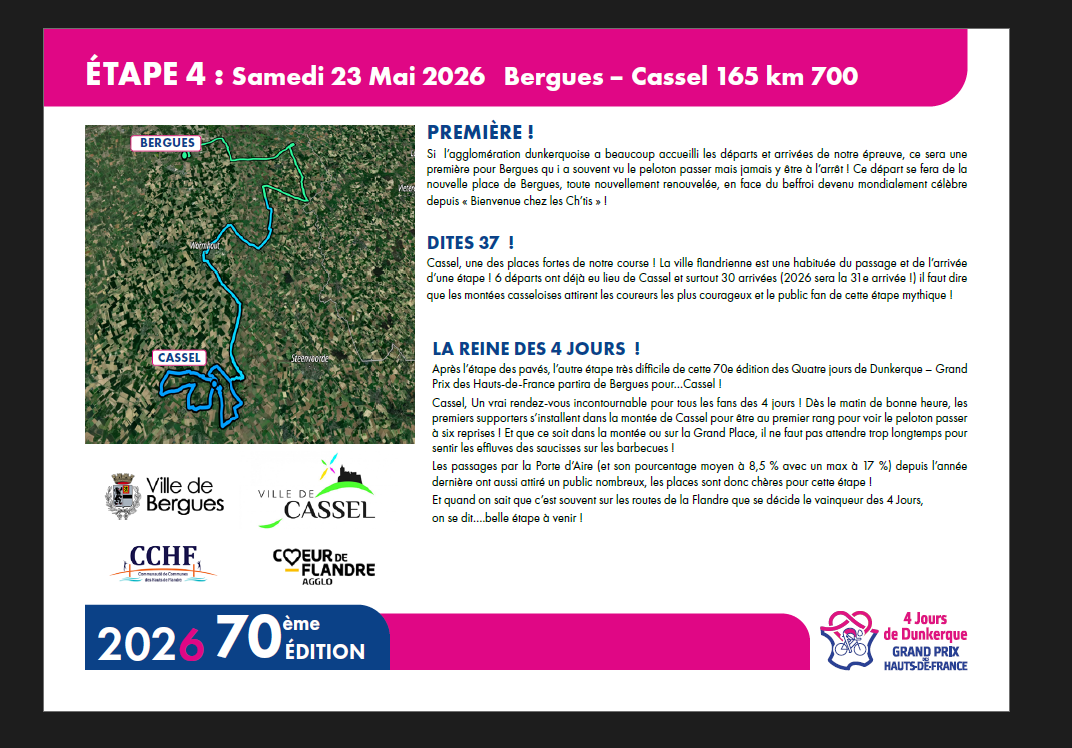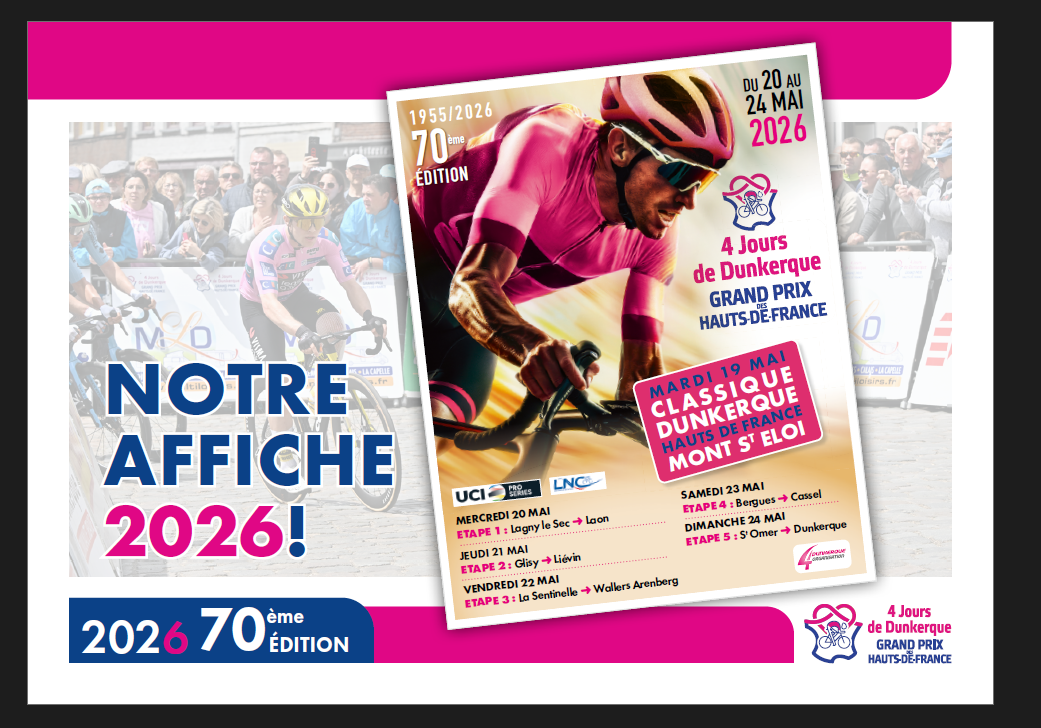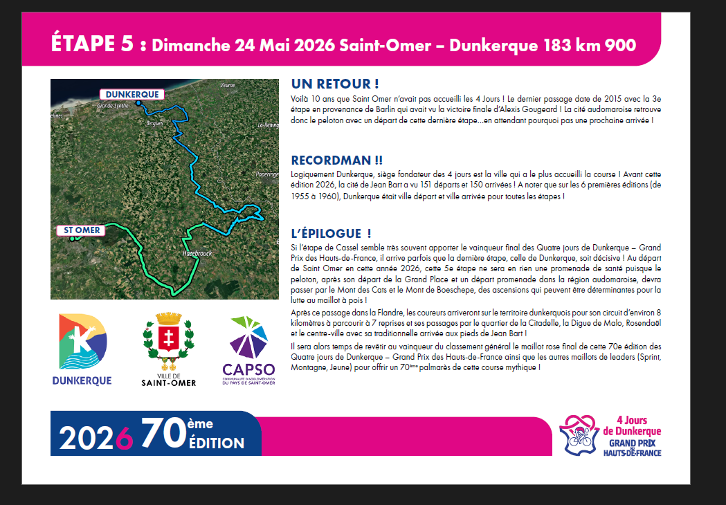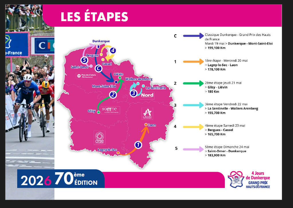 Les 4 jours Organisation présentent les parcours 2026 de la Classique Dunkerque – Hauts-de-France et de la 70e édition des 4 jours de Dunkerque- Grand prix des Hauts-de-France qui auront lieu du 19 au 24 Mai 2026 !