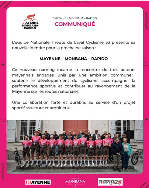 L’équipe Nationale 1 route de Laval Cyclisme 53 entame une nouvelle étape de son développement avec la présentation de sa nouvelle identité : MAYENNE – MONBANA – RAPIDO.