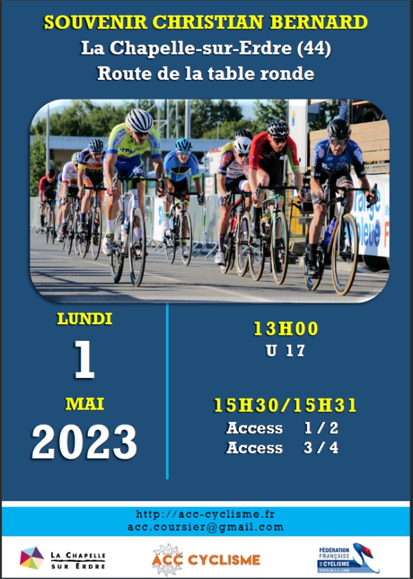 Veuillez trouver les informations sur la course Souvenir Christian Bernard qui se déroulera le Lundi 1 Mai 2023 à La Chapelle-sur-Erdre (44).
