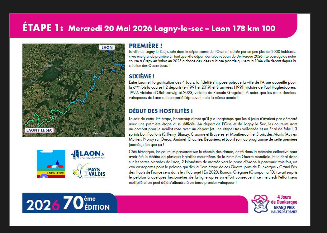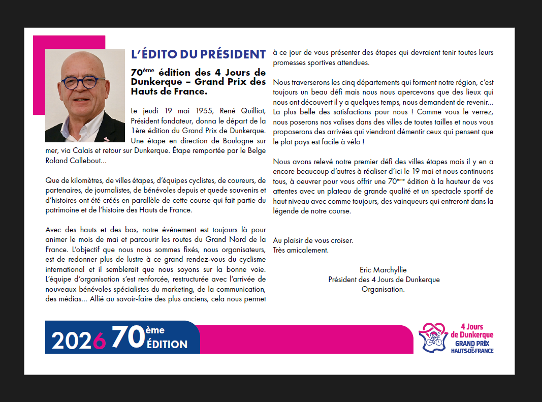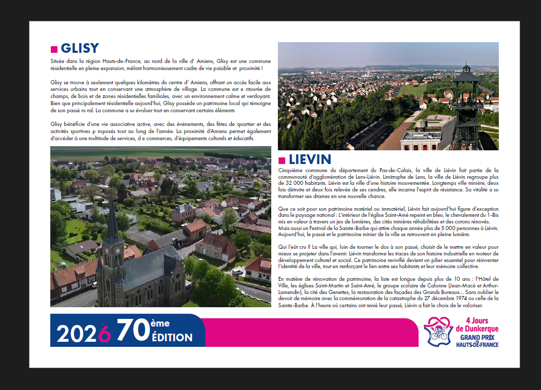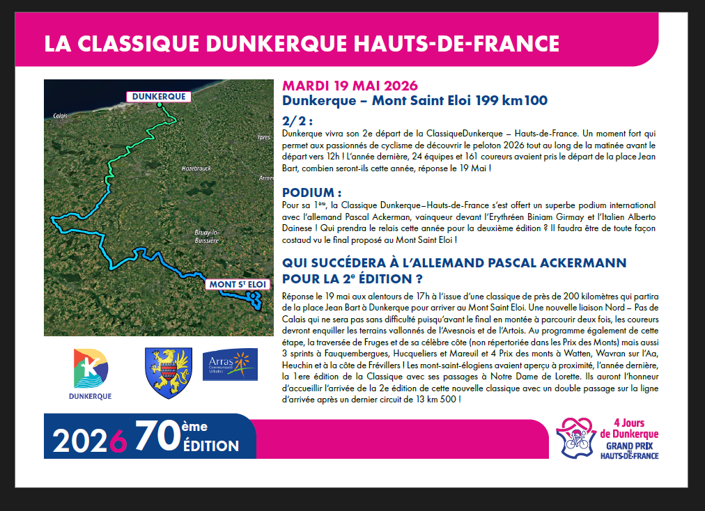 Les 4 jours Organisation présentent les parcours 2026 de la Classique Dunkerque – Hauts-de-France et de la 70e édition des 4 jours de Dunkerque- Grand prix des Hauts-de-France qui auront lieu du 19 au 24 Mai 2026 !
