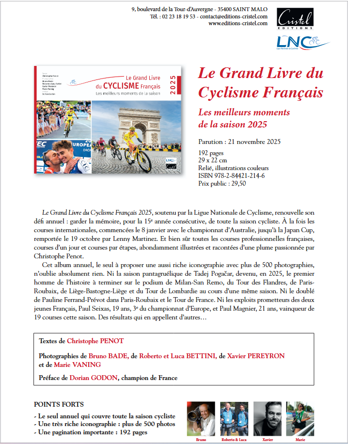 Nous sommes heureux de vous informer de la parution, le 21 Novembre 2025, du Grand Livre du Cyclisme Français 2025.