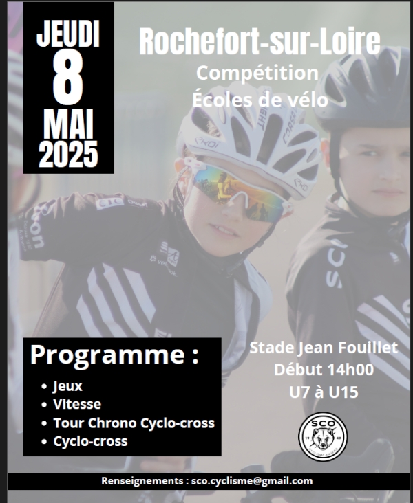 Le SCO Cyclisme Angers vous invite à participer à la rencontre Ecole de Vélo qui se déroulera à Rochefort sur Loire, le Jeudi 8 Mai 2025.