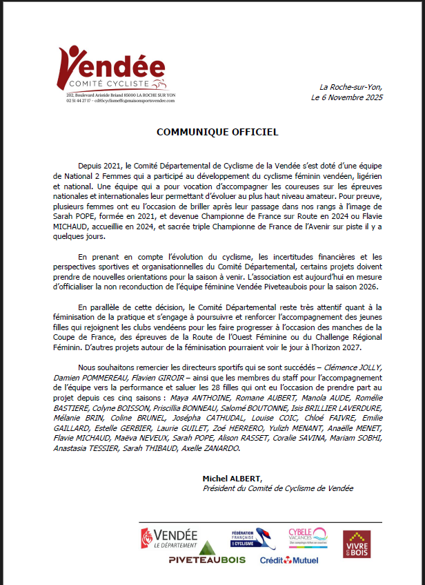 Voir en image, le communiqué officiel de l'arrêt de l'équipe Féminine de National 2 portée par le Comité Départemental de Cyclisme de la Vendée.