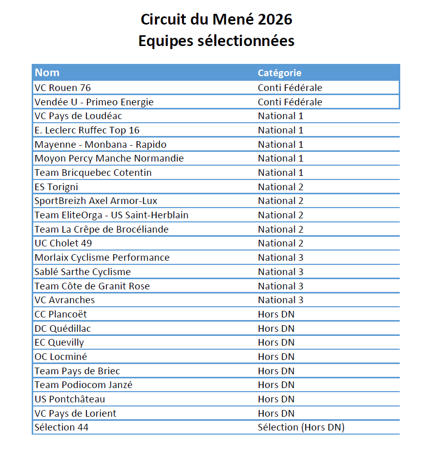 C'est avec une grande fierté que le Comité d'Organisation du Circuit du Mené dévoile aujourd'hui la liste officielle des équipes retenues pour cette 43e édition qui se déroulera le Lundi de Pâques 6 Avril 2026.
