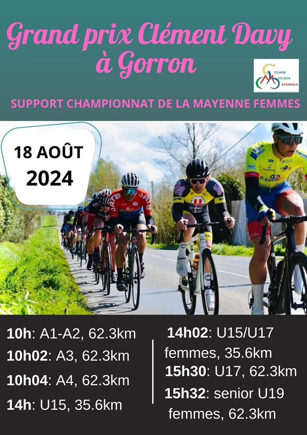 Le 18 août 2024,nous organisons le Grand Prix Clément Davy avec en support le championnat de la Mayenne Dames