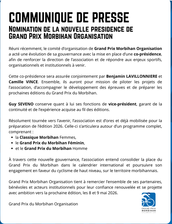Suite à la démission de Monsieur Yannick GUEGUEN, l’association Grand Prix Morbihan Organisation a procédé à la réorganisation de son bureau.