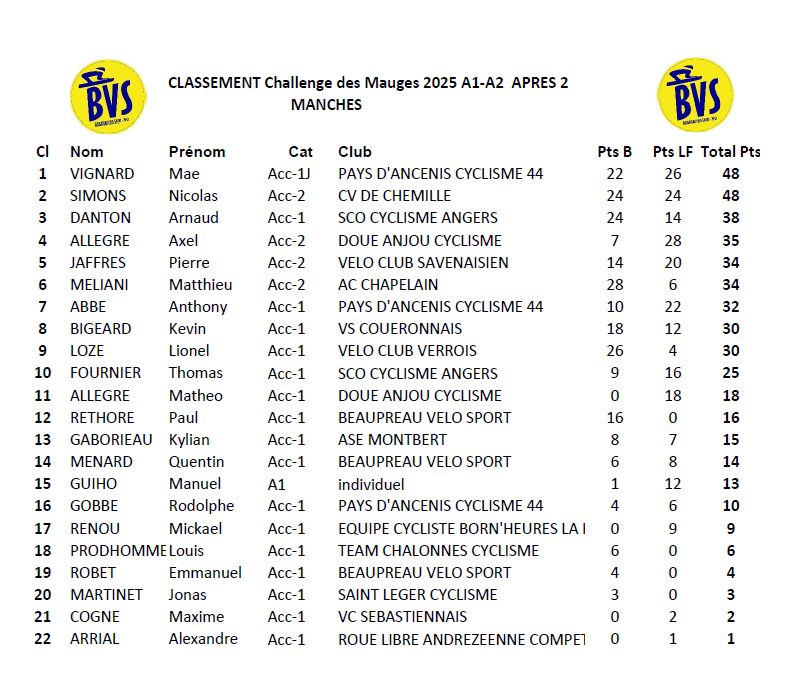 CLASSEMENT ACCESS 1.2 APRES LA DEUXIEME MANCHE A St PHILBERT EN MAUGES Remerciements à Yoann HELAINE BVS