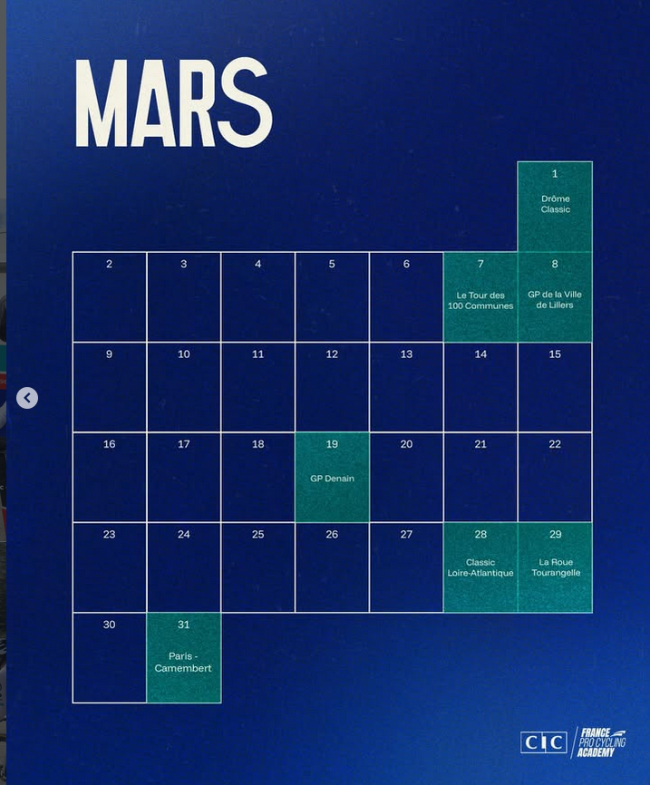 L'équipe Nantaise, le CIC Pro Cycling Academy nous présente son calendrier courses du mois de Mars.