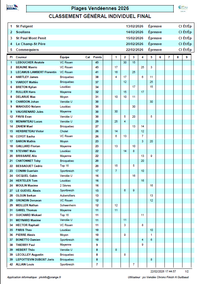 Anatole LEBOUCHER (VC Rouen 76) remporte le Classement Génréal des Plages Vendéennes 2026, devant ses 2 coéquipiers Mavric BEAUNE et Florentin LECAMUS-LAMBERT