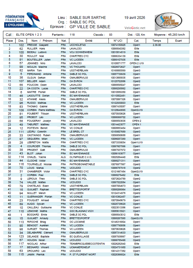VOIR LES CLASSEMENTS EN IMAGES Remerciements à Bruno OGÉPrésident du Sablé Sarthe Cyclisme Pays de la Loire